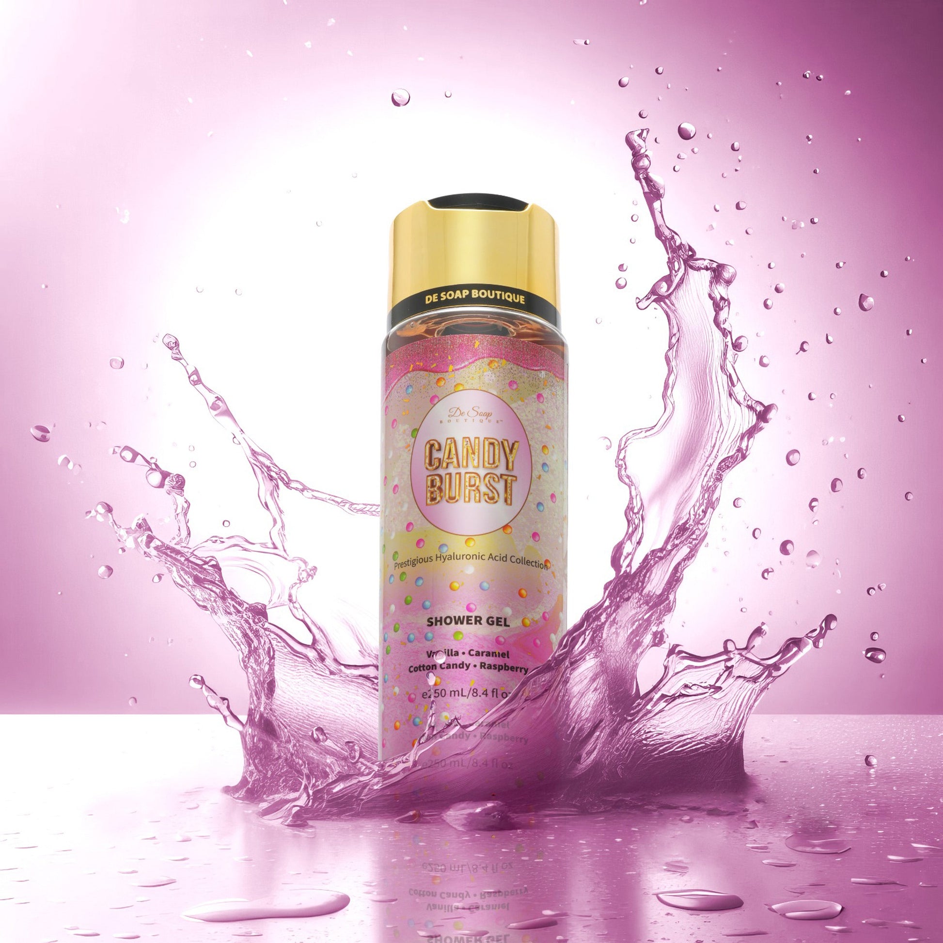 ive into a shower experience that's as indulgent as a dessert with our Candy Burst Shower Gel. This luscious gel is specifically crafted to bring joy and hydration to every skin type, offering a special treat for those battling dryness or seeking a splash of youthful radiance. At its heart, Hyaluronic Acid works wonders to quench thirsty skin, soothe irritation, and diminish redness, leaving your complexion looking and feeling rejuvenated.